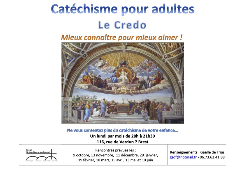 Le catéchisme pour adultes reprend un lundi par mois. Première réunion le 9 octobre à 20h au 116 rue de Verdun. Puis aux dates suivantes