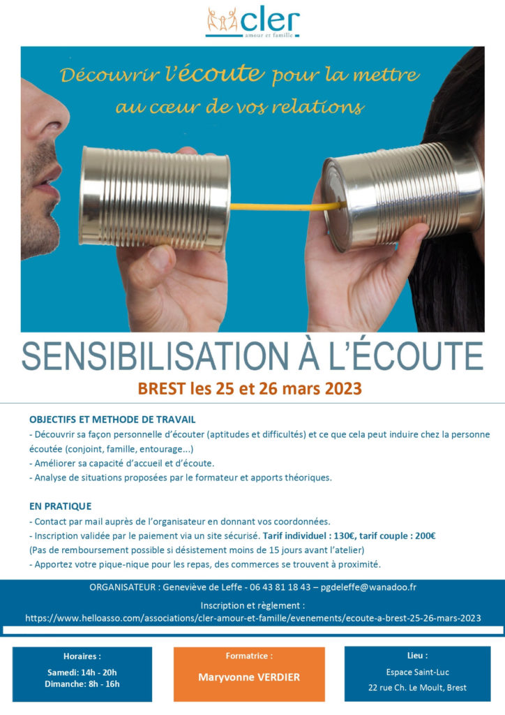 Et si (vous) vous offriez un week-end pour découvrir, améliorer… vos relations en couple, en famille , au travail… grâce à l’écoute ? RDV les 25 et 26 mars 2023 à l’Espace St Luc de Brest.
