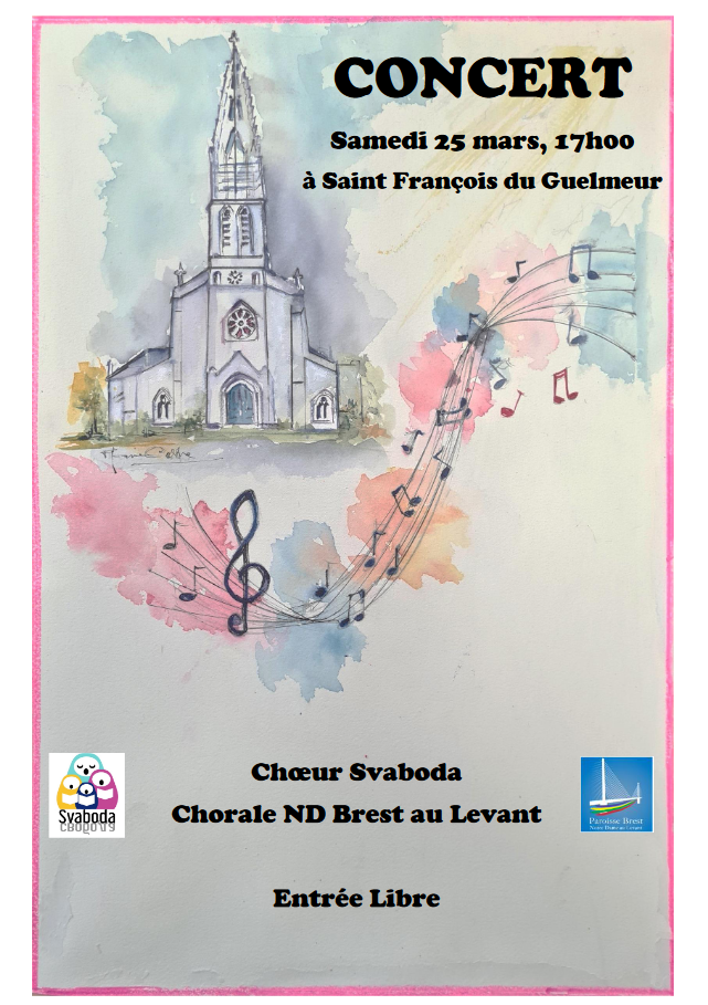 Concert de la chorale de notre paroisse Notre-Dame Brest au Levant avec le chœur Svaboda (chants orthodoxes) le samedi 25 mars à 17h00 à l’église Saint François du Guelmeur.