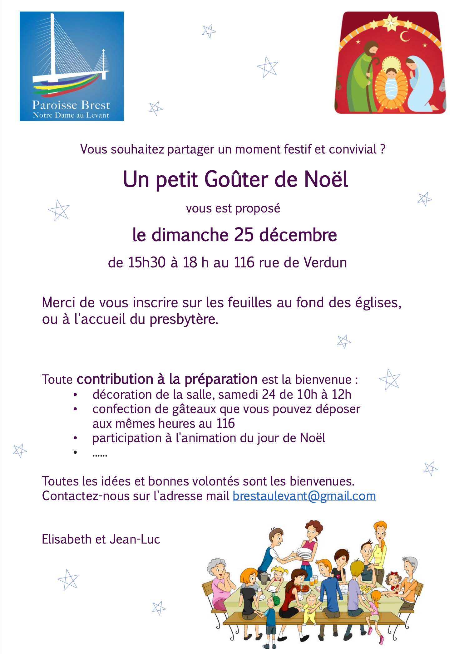 Toute contribution à la préparation est la bienvenue : décoration de la salle (samedi 24 de 10 h à 12h), confection de gâteaux (dépôt le samedi 24 entre 10h et 12h au 116 rue de Verdun), participation à l’animation du jour de Noël.