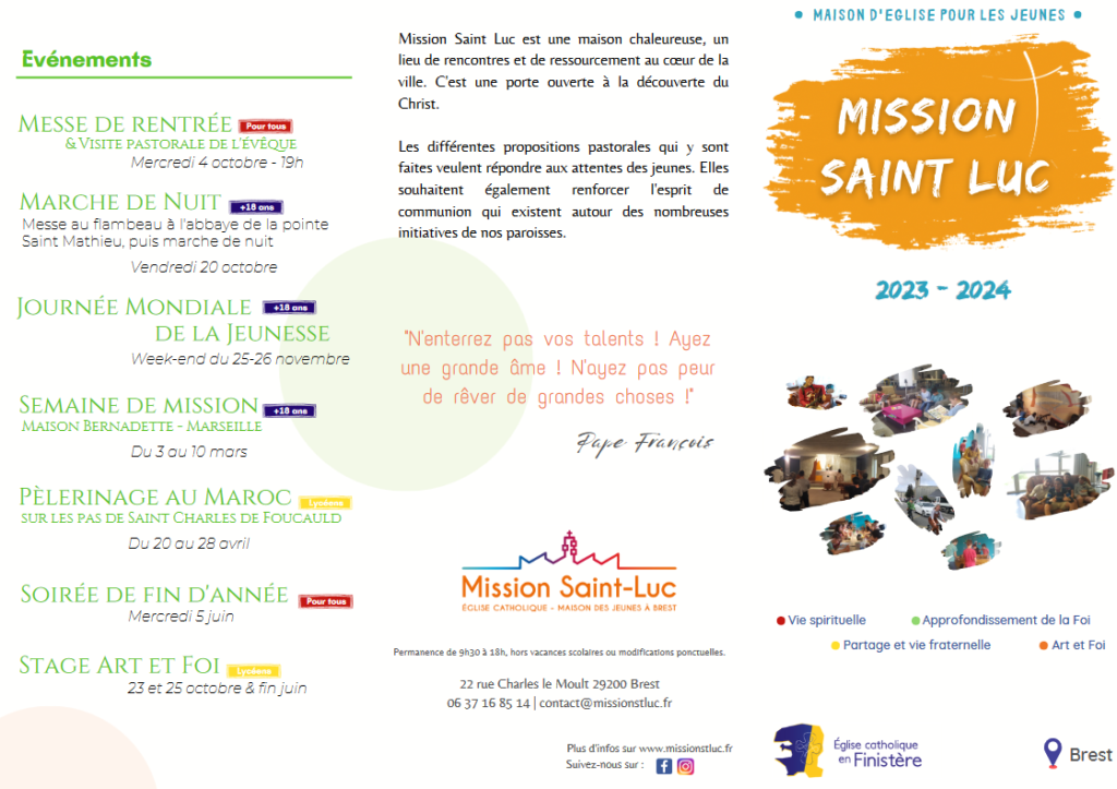 La messe de rentrée de Mission Saint Luc, présidée par l’évêque, sera le mercredi 4 octobre à 19h dans l’église Saint Luc. Elle sera précédée d’une visite pastorale de Monseigneur Dognin.