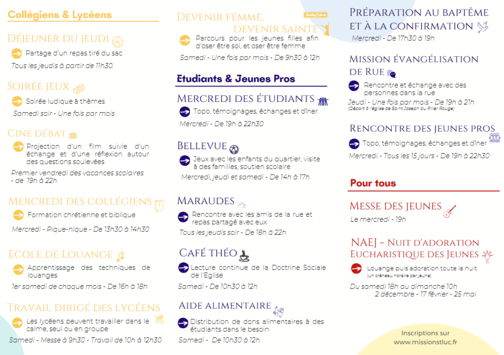 Mission Saint Luc propose de nombreuses activités pour les collégiens, lycéens, étudiants et jeunes professionnels : soirée jeux, ciné-débat, nuit d’adoration, aumônerie des étudiants, rencontre des jeunes professionnels, mercredi des collégiens, travail dirigé des lycéens…