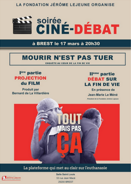 Le documentaire « Mourir n‘est pas tuer – enquête au cœur de la fin de vie » est diffusé au cours de soirées cinés débats organisées par la fondation Jérôme Lejeune. Brest sera la sixième ville de France à accueillir ce ciné débat, le vendredi 17 mars 2023, à 20 h 30 à la salle Saint-Louis (53 rue Jean-Macé).